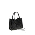 The Le City Tote mini Handbag by Balenciaga is an elegant and functional accessory, crafted from Arena lambskin with brass hardware. The tote design features two top handles and a removable, adjustable strap, offering versatile carry by hand or on the shoulder. It includes a magnetic closure, a front zip pocket with a knotted leather puller, as well as one main compartment and an interior zip pocket. The cotton canvas lining completes the design with a practical and refined touch.